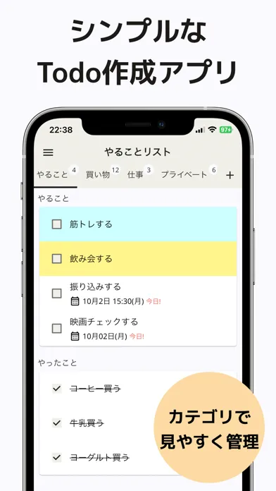 Manage your tasks simply and clearly with our to-do list app. Organize tasks by categories such as "Shopping," "Work," and "Private" for easier management.