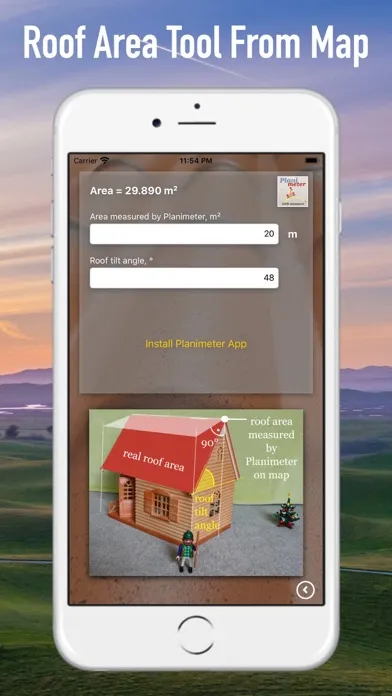 - Roof area calculation based on Planimeter* app measurement and roof tilt angle.