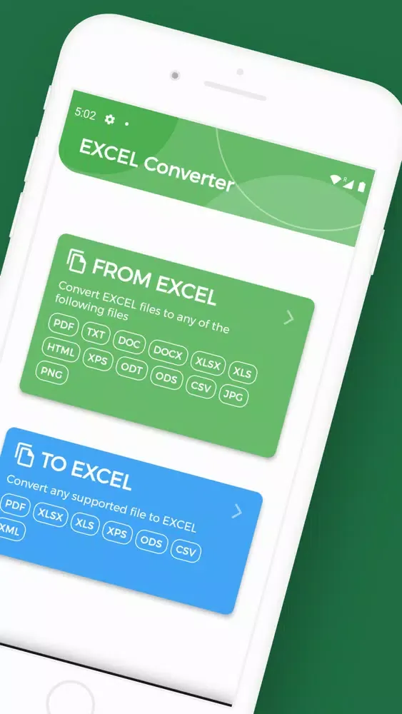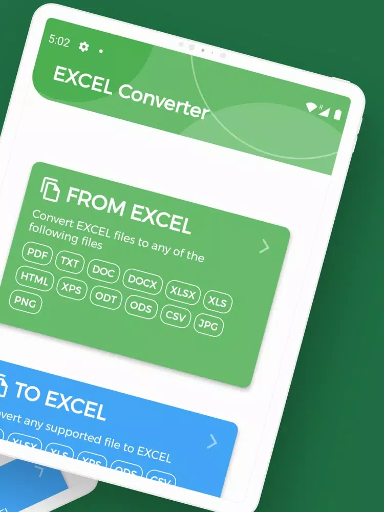 This conversion application allows you to convert any EXCEL file to other files like PDF, TXT, WORD, DOCX, XLSX, HTML, XPS, ODT, ODS, CSV, JPG and PNG, it can also convert other files to EXCEL.