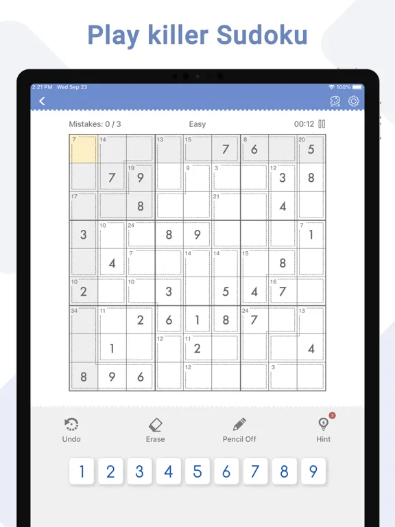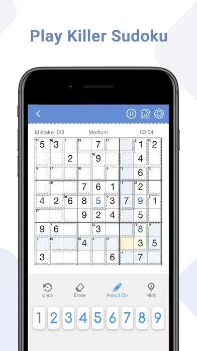 Killer Sudoku is a logic-based number puzzle game and the goal is to place 1 to 9 digit numbers into each grid cell so that each number can only appear once in each row, each column and each mini-grid. With our Sudoku puzzle app, you can not only enjoy sudoku games anytime anywhere, but also learn Sudoku techniques from it.