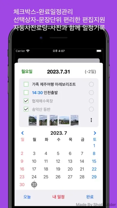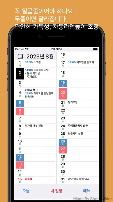 글자수에 따라 크기가 자동변경되는 입력창과 메모형태로 쉽게 많은 일정들을 기록할 수 있습니다