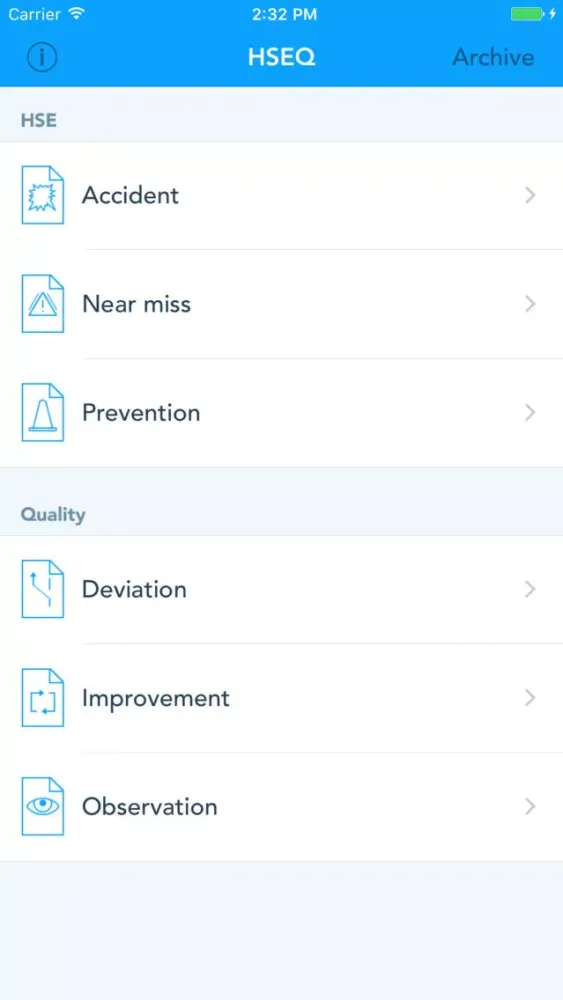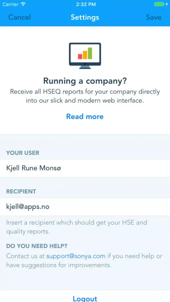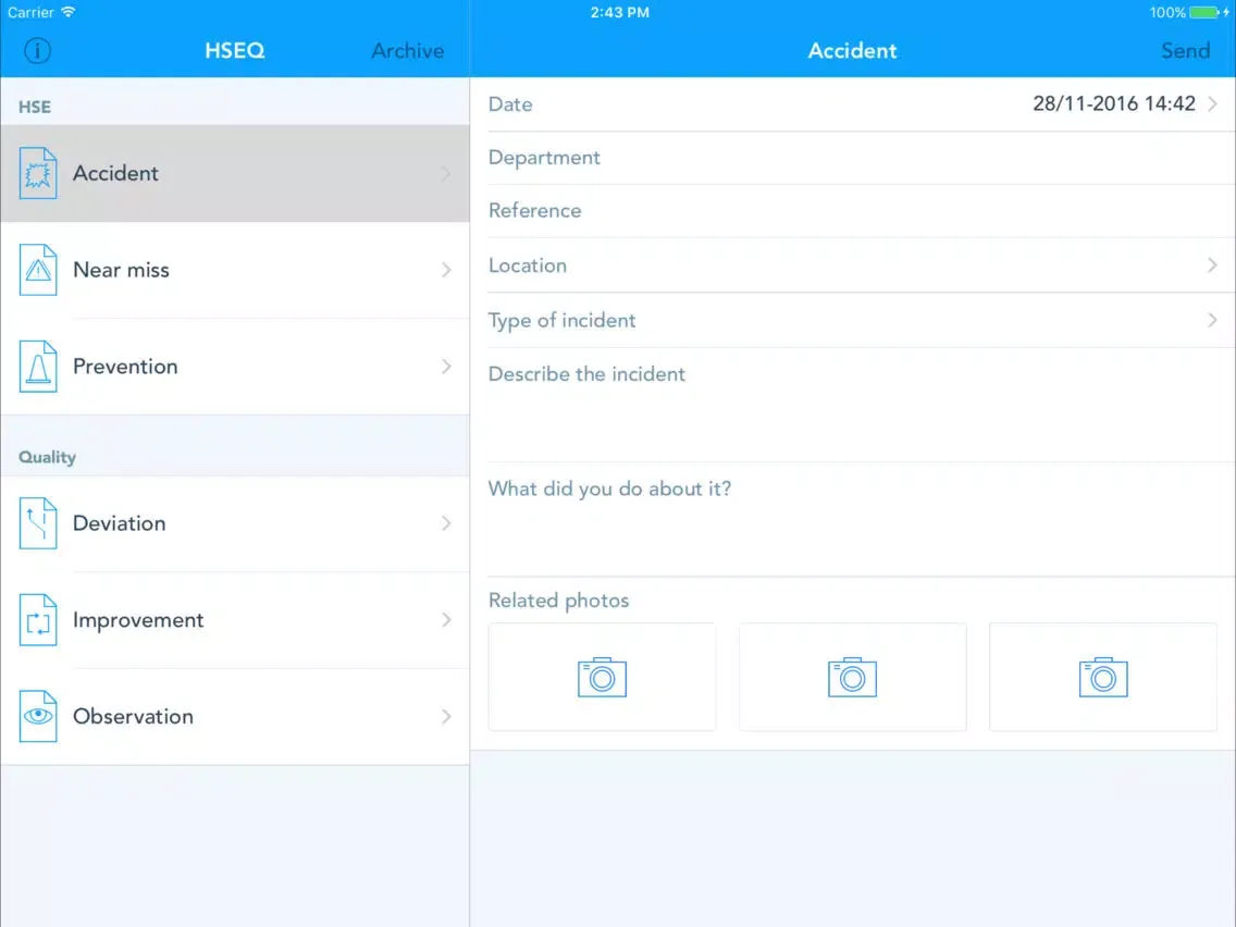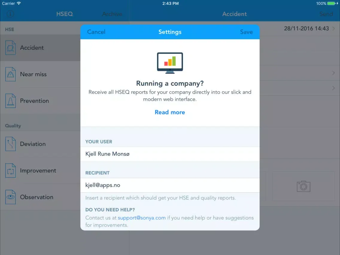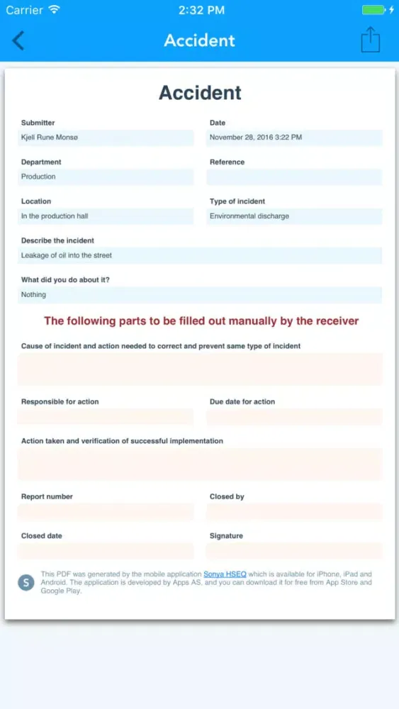 With Sonya HSEQ you can streamline how your business is handling reporting related to health, environment, safety and quality. Your employees start by filling out various HSE and quality reports. The reports can then be sent as PDF to a predefined e-mail address of your choice. The first version of the application supports the following reports: accident, near miss, prevention, deviation, observation and improvement.