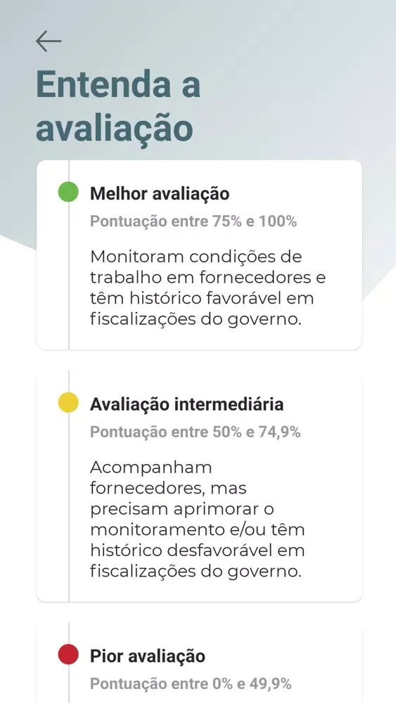 O app não recomenda que o consumidor compre ou deixe de comprar roupas de determinada marca. Apenas traz informações para que faça a escolha de forma consciente. Trata-se de um serviço gratuito ao consumidor, fruto da apuração da equipe de jornalismo da Repórter Brasil.