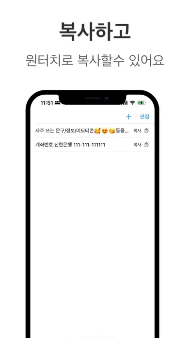 자주 사용하는 문구/정보/이모티콘등을 손쉽게 복사하고 붙여넣으세요!