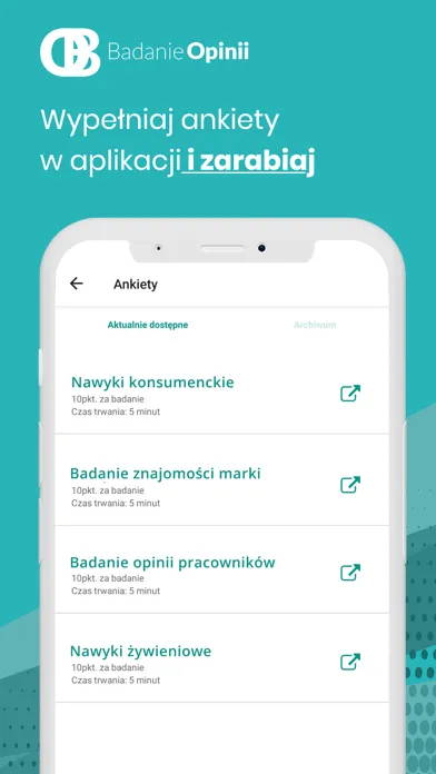 Pobierz aplikację Badanie Opinii i zacznij zarabiać! Podziel się z nami swoją opinią, wypełniaj ankiety w dowolnym miejscu i czasie ze swojego telefonu. Zbieraj punkty i wymień na gotówkę - wystarczy, że podasz kilka informacji o sobie, a już po chwili będziesz mógł otrzymać swoje pierwsze ankiety. To Ty decydujesz, które ankiety chcesz wypełnić. Aplikacja pozwala na zapraszanie znajomych, dzięki czemu jeszcze szybciej zbierzesz punkty potrzebne do wymiany.