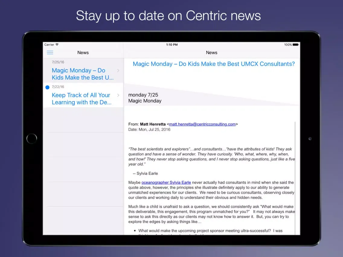 Download the Centric Consulting app and get immediate access to many of our most popular business consulting and digital services including mobile, business process management, analytics and portal/social collaboration. This app features Centric’s most recent service offering news and thought leadership.