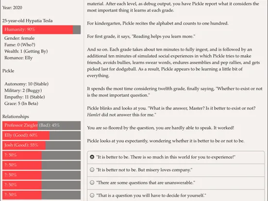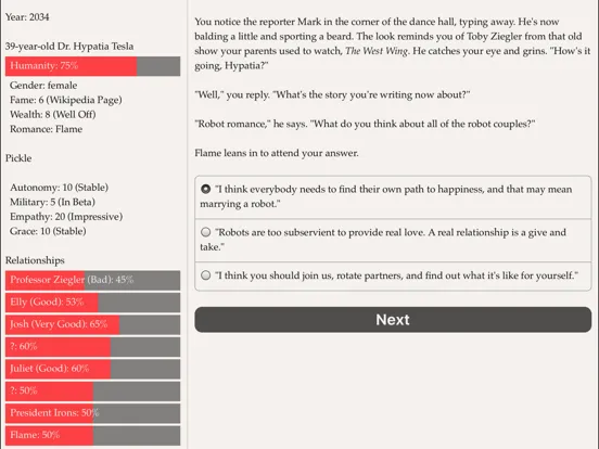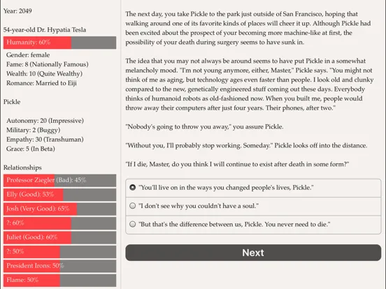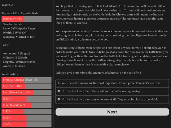 Play out thirty years of your life as a brilliant robot maker, from graduate school near the present day to a future in which your robots have changed everything. Depending on your choices, your robots may be independent or obedient, clumsy or graceful, empathic or cold…and you yourself may live to an old age happily married or alone with only robots to comfort you.