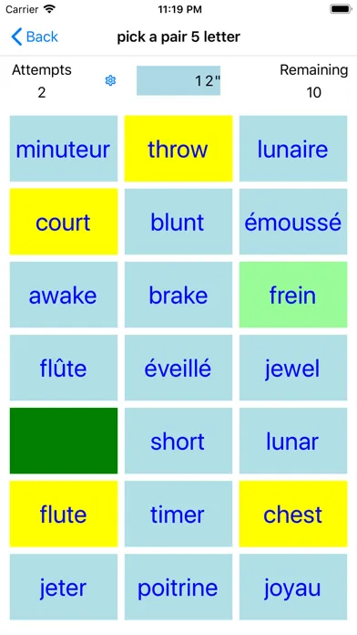 A tiny pick a pair app that helps you along, with learning the basics of French. Containing 1, 2, 3, and 4 (free), 5, 6, 7, 8 and 9 letter (paid for) English words translated to French for you to play at pick a pair. Test your self on the go!