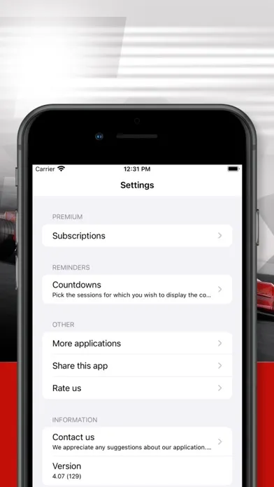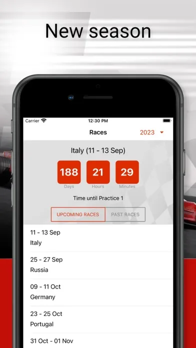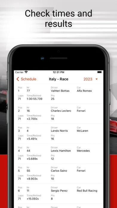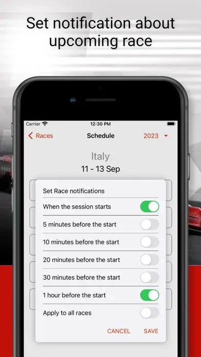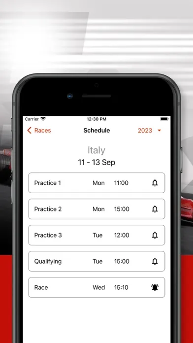 Set notifications for a specific race and event (when the race starts, half hour before, hour hour after etc.) for every race of your favorite driver or team and be aware about upcoming events!