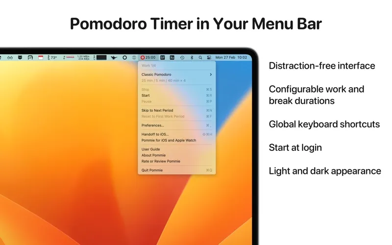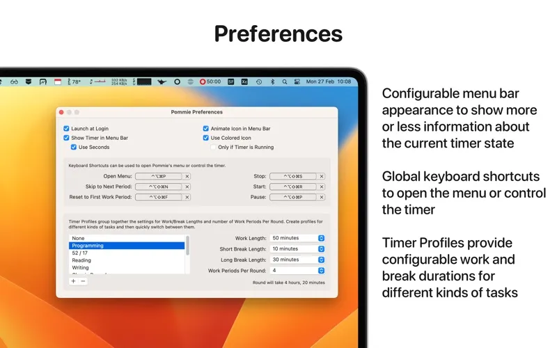 • Configurable system-wide keyboard shortcuts to open the menu or control the timer.