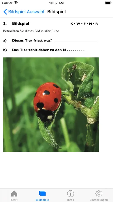 Die App enthält 5 Bildspiele, sowie jeweils eine Tast-, Geruchs- und Geschmacksübung..