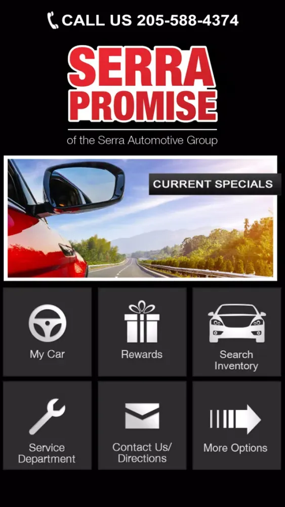 The Serra Promise Mobile App is designed for customers of Serra Ford, Serra Nissan, Serra Gardendale Kia, Serra Trussville Kia, Serra Nissan of Sylacauga, Serra Honda of Sylacauga, Serra Volkswagen, Serra Chevrolet, Serra Hyundai, and Tony Serra Nissan with locations in Sylacauga AL, Birmingham AL, Gardendale AL and Cullman AL. This app allows you to view and track your participation in the dealership's loyalty program and to view the service history of your vehicle. In addition, you are eligible for exclusive deals on service made available only to Mobile App Users!