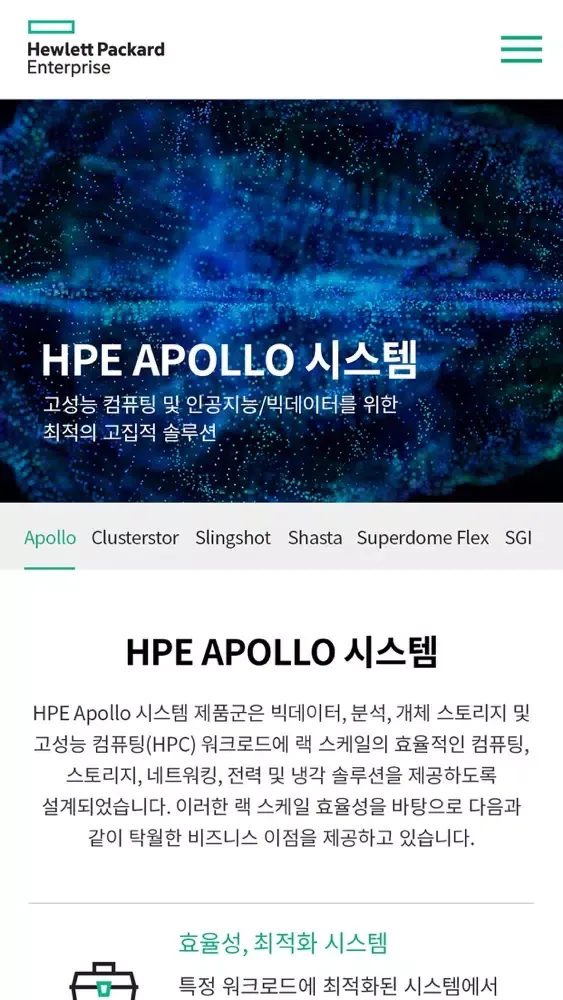 HPE는 SGI, Cray 등 HPC 업계의 다양한 기술 및 솔루션을 인수하여 업계 최고의 HPC 및 AI 솔루션 포트폴리오를 갖추게 되었습니다. 엑사스케일급 고성능 컴퓨팅 시대에 대응하기 위한 서버, 스토리지, 인터커넥트 및 소프트웨어 솔루션을 토대로 업계에서 가장 포괄적인 포트폴리오를 완성하여, 고객의 디지털 트랜스포메이션을 가속화할 수 있는 데이터 집약적인 신규 워크로드 및 빅데이터 기반 실시간 애널리틱스를 구현할 수 있도록 합니다.