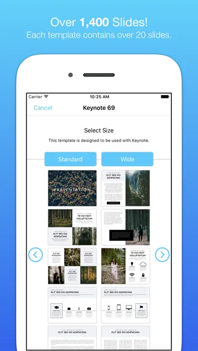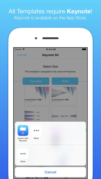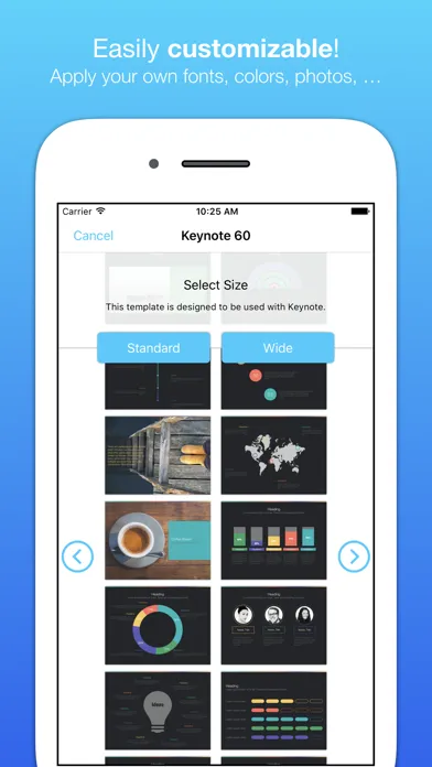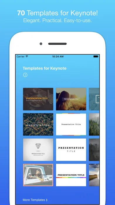 Templates for Keynote (for iPad, iPhone, iPod touch) is an amazing add-on for Apple's Keynote app. It provides 70 stunning templates for Keynote, each with over 20 ready-to-use slides to suit everyone's needs.