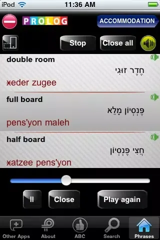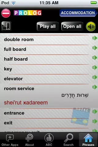 This phrase guide is published by Prolog, an Israeli publishing company that for the last 25 years has specialized in Hebrew self-learning courses for English speakers. We are now offering the application version of the best and most popular series of its kind for teaching Hebrew to English speakers. Its new and one-of-a-kind features make learning and speaking even easier and more enjoyable! And best of all, by touching a line of text, you can listen to a fluent narration of the Hebrew translation.