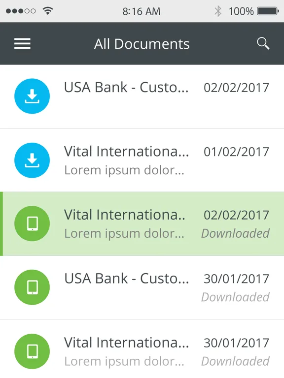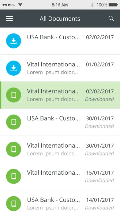 Digital Advantage Showcase provides access to mobile content (such as Dynamic Communications documents) delivered to the application through Quadient Cloud's Content Delivery Service. Furthermore, you can access customer communications directly from push notifications, or leverage the concept of in-app notifications, which allow sending non-intrusive messages to mobile applications without bothering the user with notifications when he or she is not using the app. Both the mobile application screens and the in-app notifications can easily and rapidly be personalized and amended to fit all screen sizes and/or to adapt to any client branding.