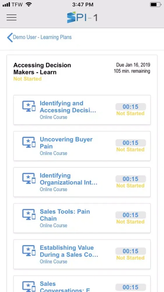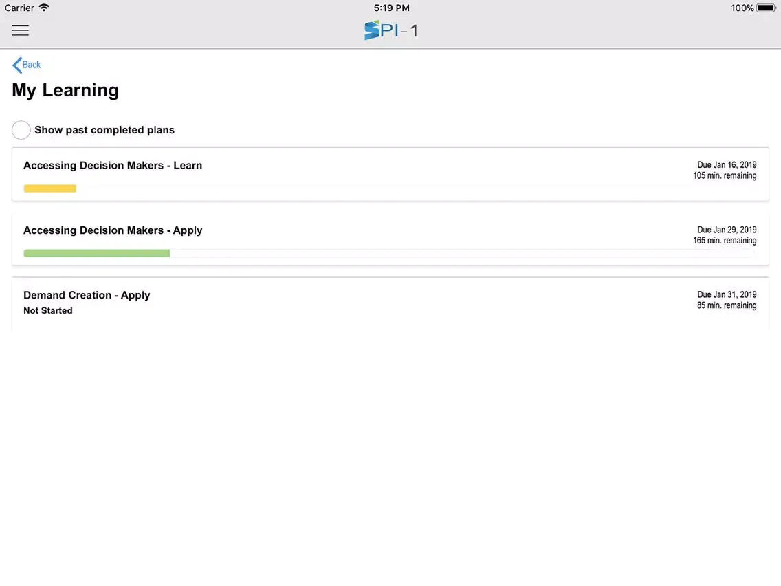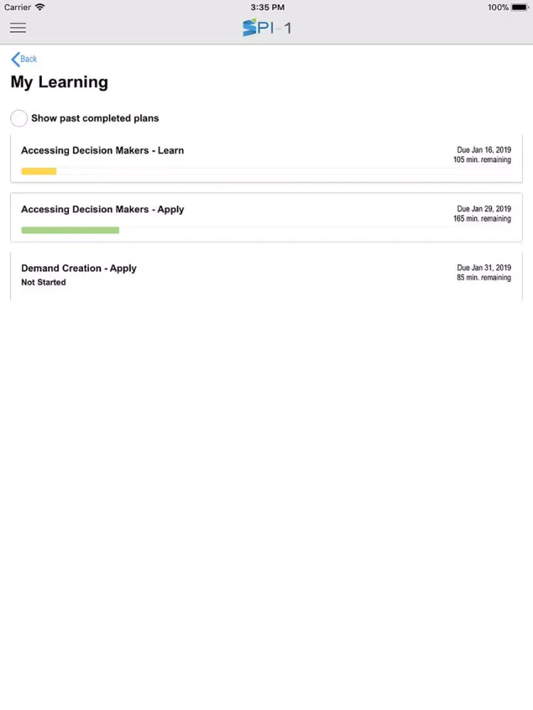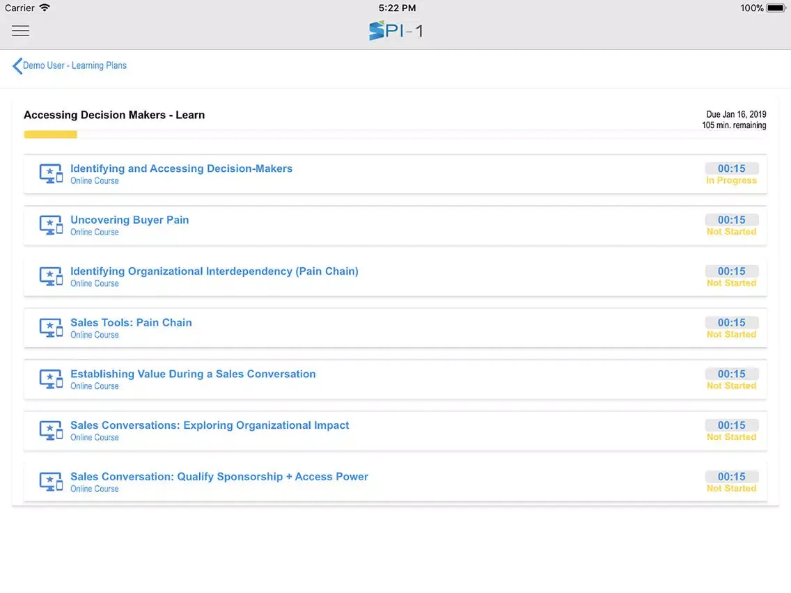 The SPI-1 Sales Performance Platform drives lasting behavior change and outcomes for organizations by aligning training and development with key sales goals and metrics. The platform provides in depth competency assessment, individualized development of specific competencies, step-by-step playbooks with guided selling assistance, and analytics that accurately monitor development progress versus outcomes.
