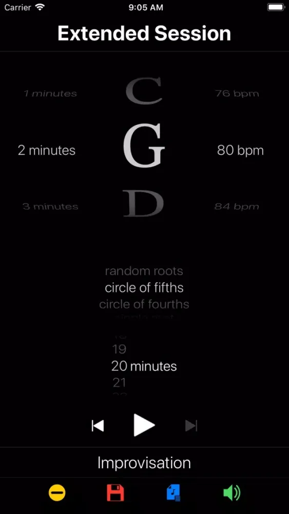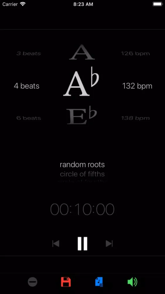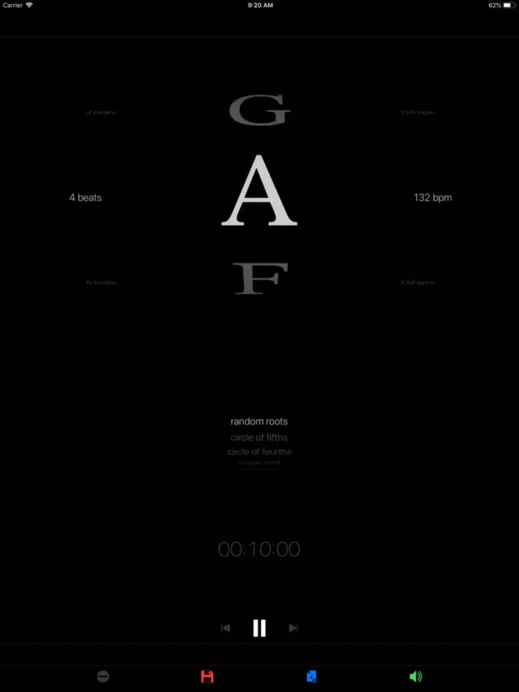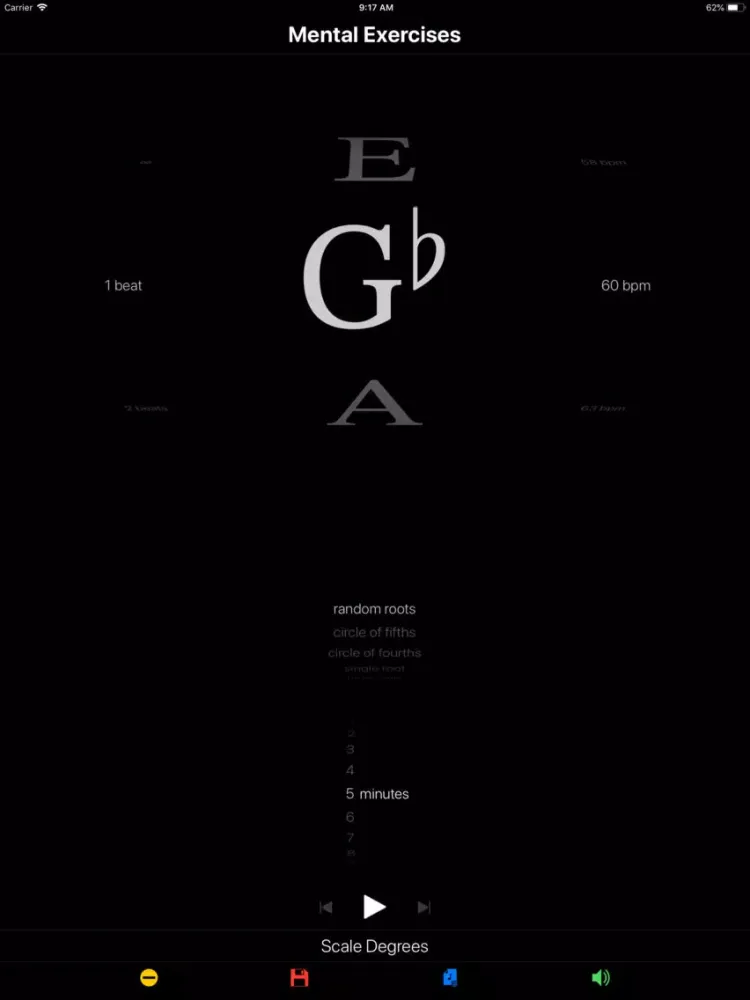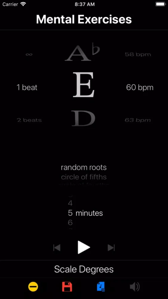 Create exercises that loop through random roots, follow the circle of fourths and fifths, or drill a single root. Each root is an exercise prompt for a configurable period of time, measured in beats, seconds or minutes. Schedule the countdown timer to divide your practice into focused blocks. Try Rutabaga with scales, intervals, chords, inversions, progressions, lines, riffs, runs and improvisation. Save exercises to playlists to create a structured practice routine.