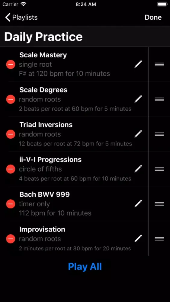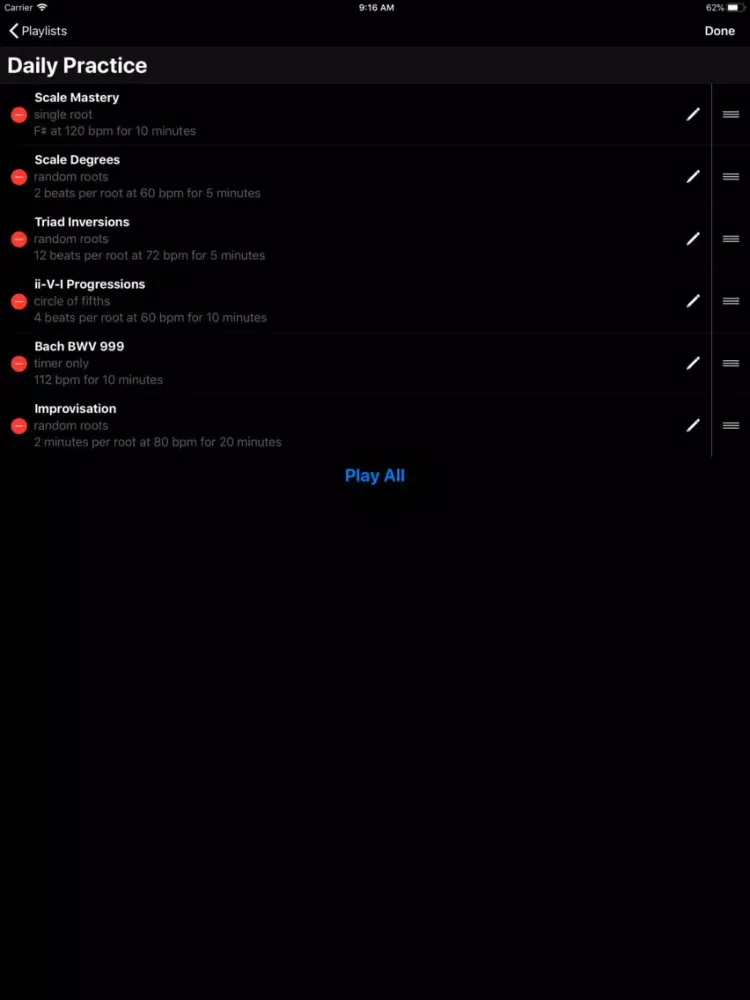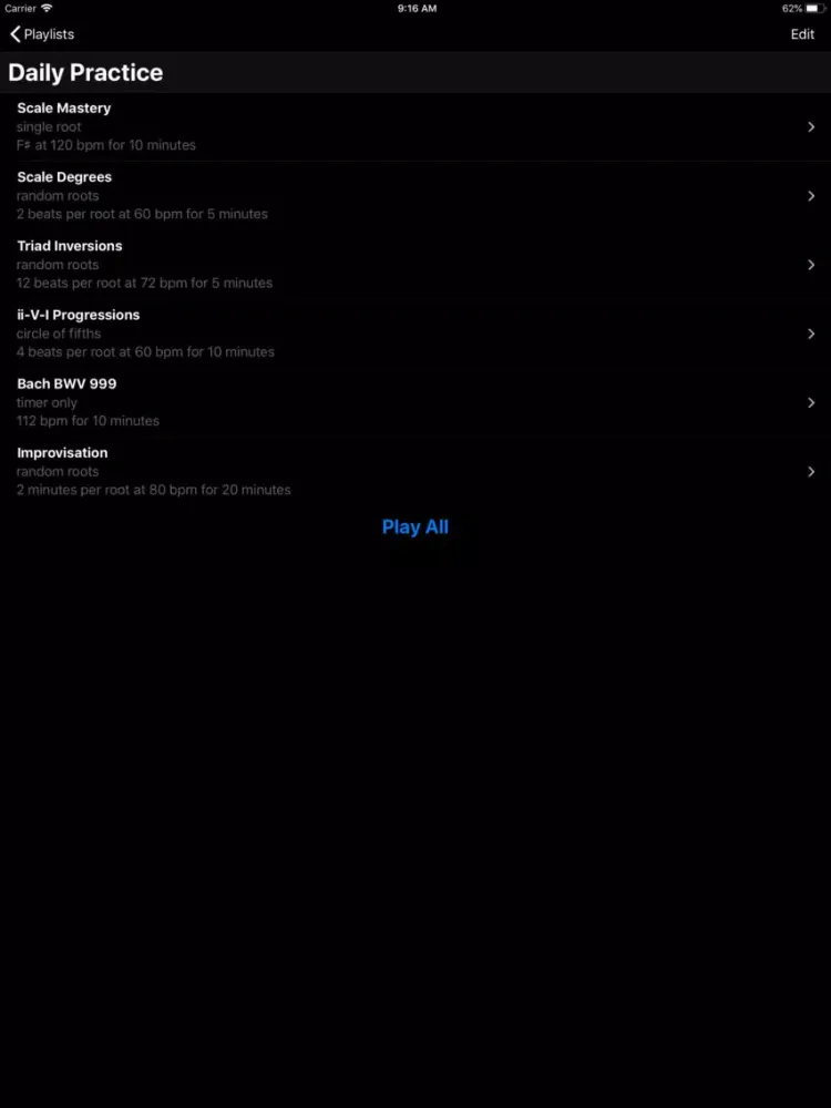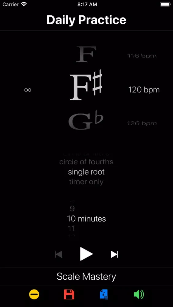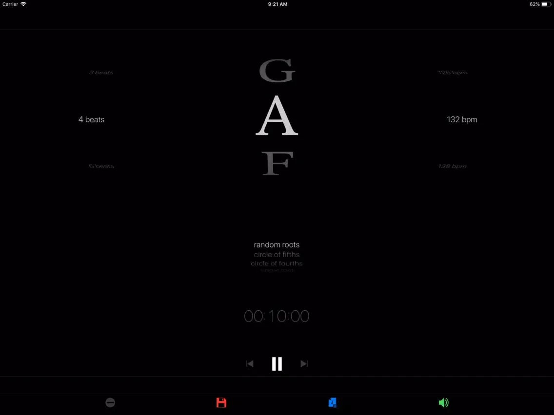 Create exercises that loop through random roots, follow the circle of fourths and fifths, or drill a single root. Each root is an exercise prompt for a configurable period of time, measured in beats, seconds or minutes. Schedule the countdown timer to divide your practice into focused blocks. Try Rutabaga with scales, intervals, chords, inversions, progressions, lines, riffs, runs and improvisation. Save exercises to playlists to create a structured practice routine.