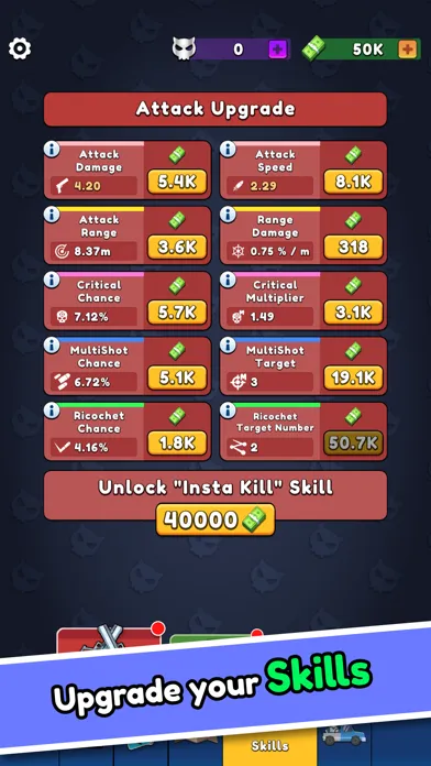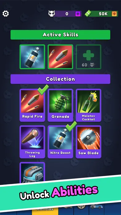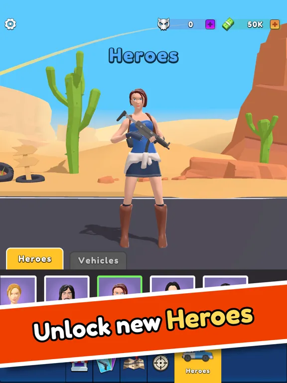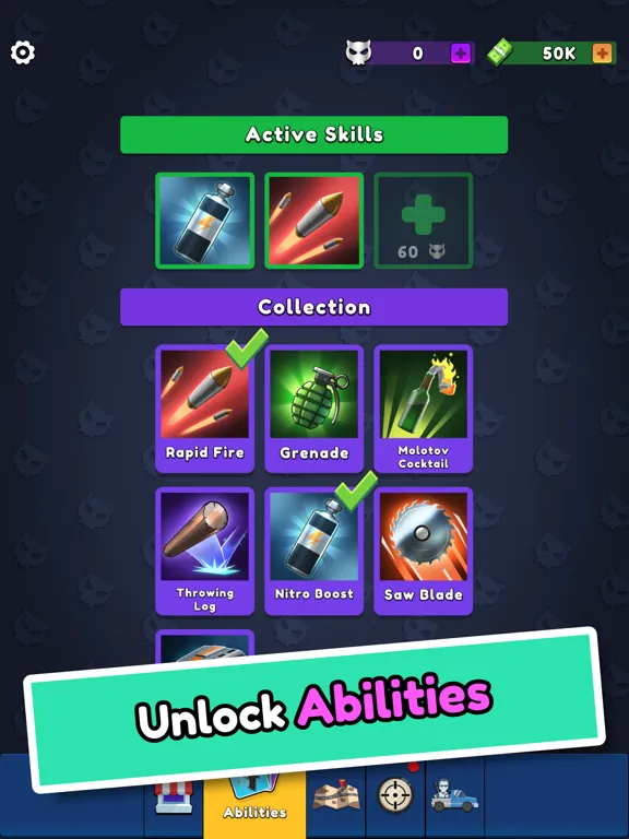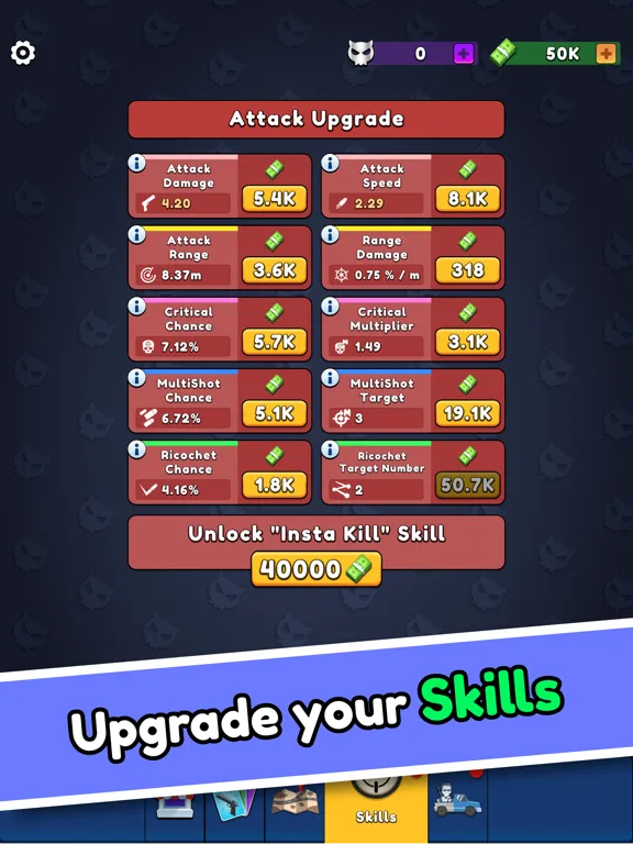 Remember that any upgrades you make during the race will be burned after you lose. But that's okay, shooter! Every defeat is an opportunity to make yourself better, so that the next time you come back to the battlefield you can win. Between battles you have the chance to improve your stats permanently for the money! Moreover, for skull currency you can unlock cards with unique passive and active skills, which you can use with a tap during the fight!