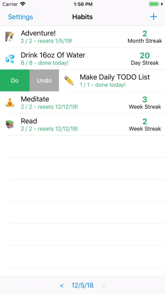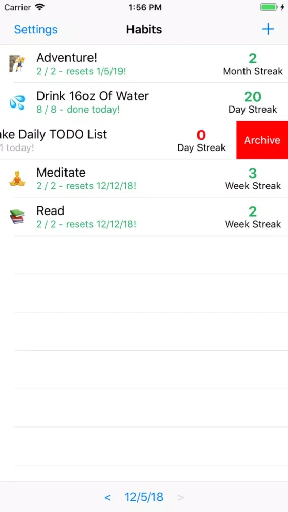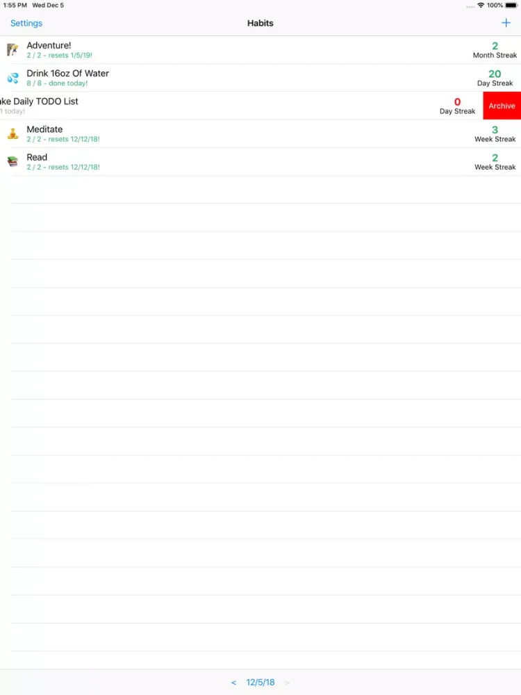 Streaking is a simple habit tracker - nothing more. Add habits you want to keep track of, swipe them whenever you do them, delete them whenever you're done with them. If you want to update a habit or look at statistics about it, all it takes is a tap.