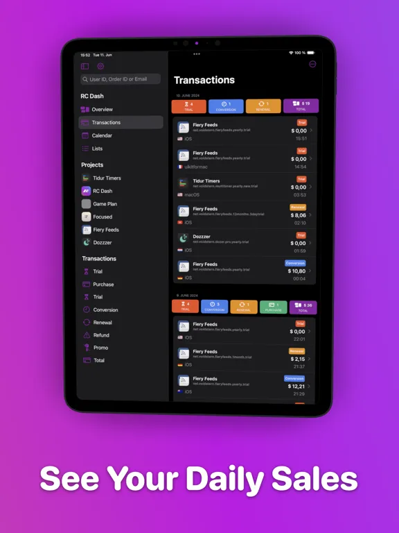 See your daily transactions by type, your daily revenue by app and all of the day's transactions.