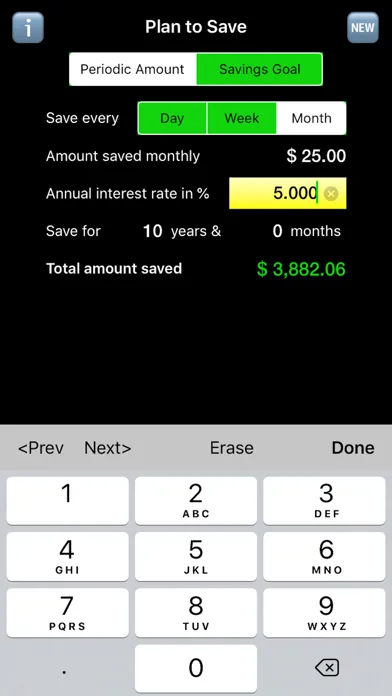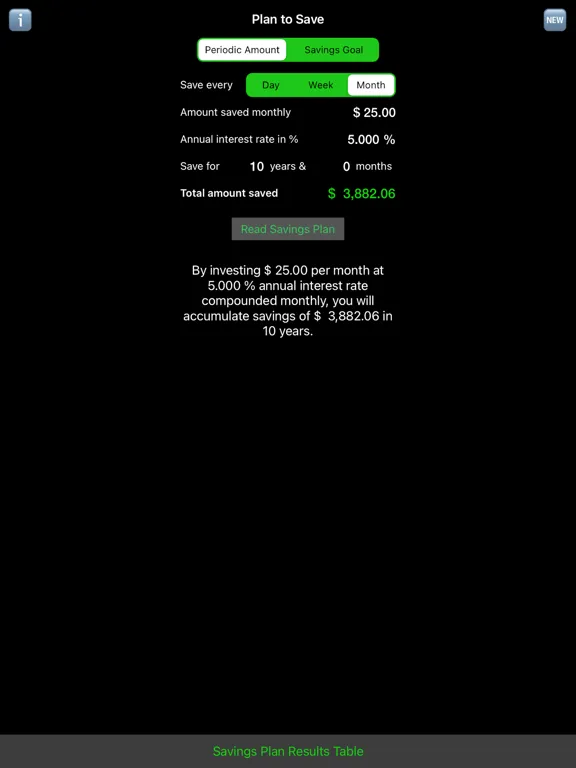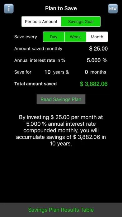 Use this app to determine a savings plan in one of two ways: by computing how much will be accumulated by saving a particular amount period (day, week, or month) over a given amount of time, or by computing how much must be saved each period over time to achieve your savings goal.