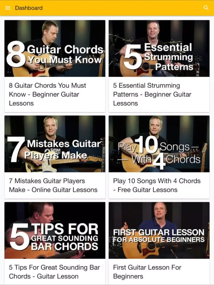 The videos will teach you important concepts to improve the way you play the guitar. You can start with the beginner guitar lessons, then learn some new guitar chords, and even play-along to some of our free guitar jam tracks!