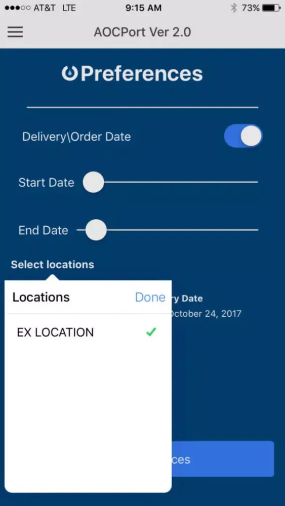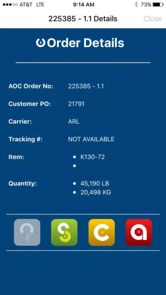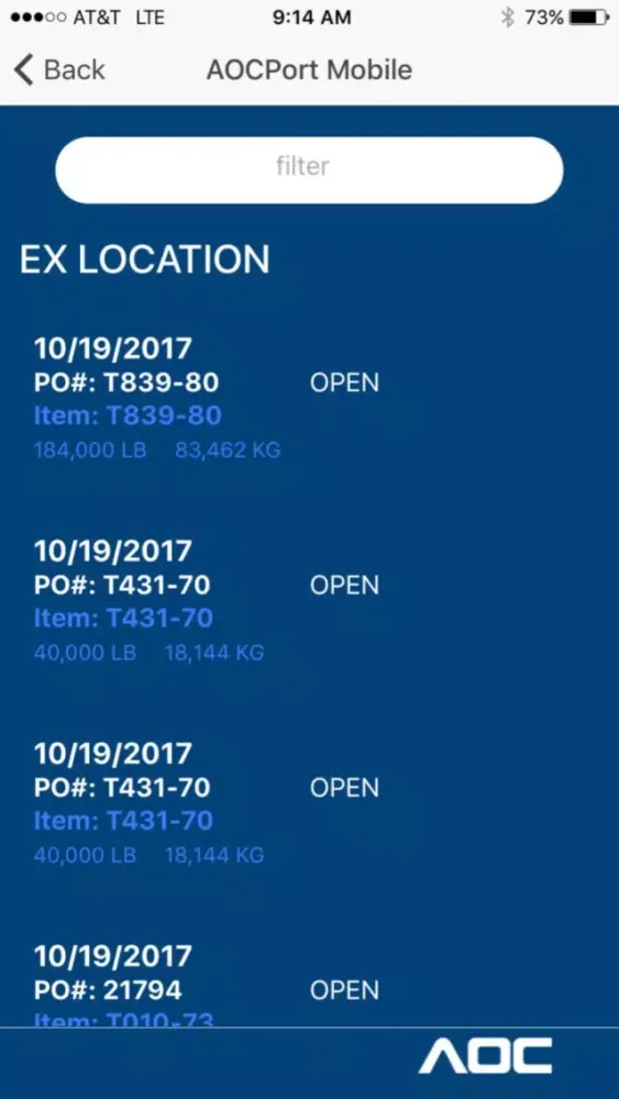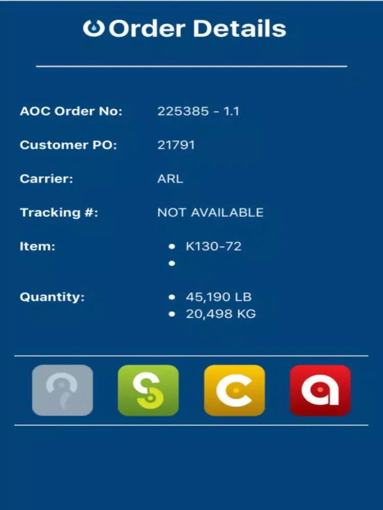 After logging in to the app using your AOCPort credentials, simply set your data preferences, save them and your order data will be retrieved. From the main screen you can view the current status of an order, quantity ordered, and the date the order was placed. From there you can drill down on the details of an order to access additional information and access the documents associated with your order as they are available.