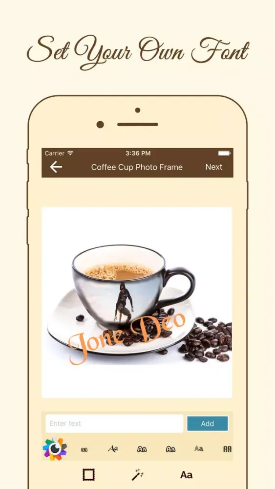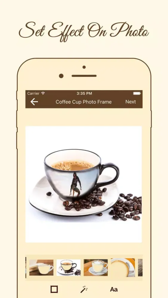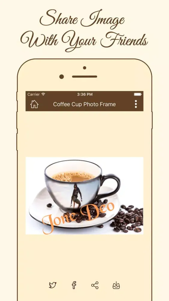 With this coffee cup app, you can edit pictures from gallery or camera pictures, choose the coffee mug photo frame of your choice, add text, save in high definition (HD) quality and share with your loved ones.