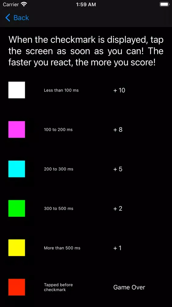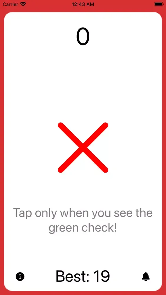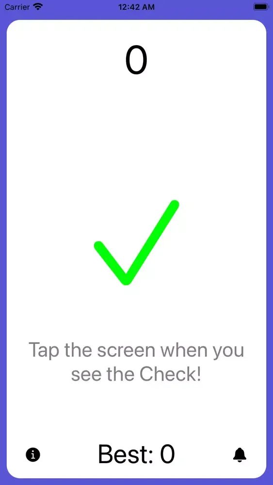 The goal is simple: When you see the green checkmark, tap anywhere on the screen as fast as you can. The faster your reaction time, the higher you score! Press the screen when there's no checkmark however, and it's game over.
