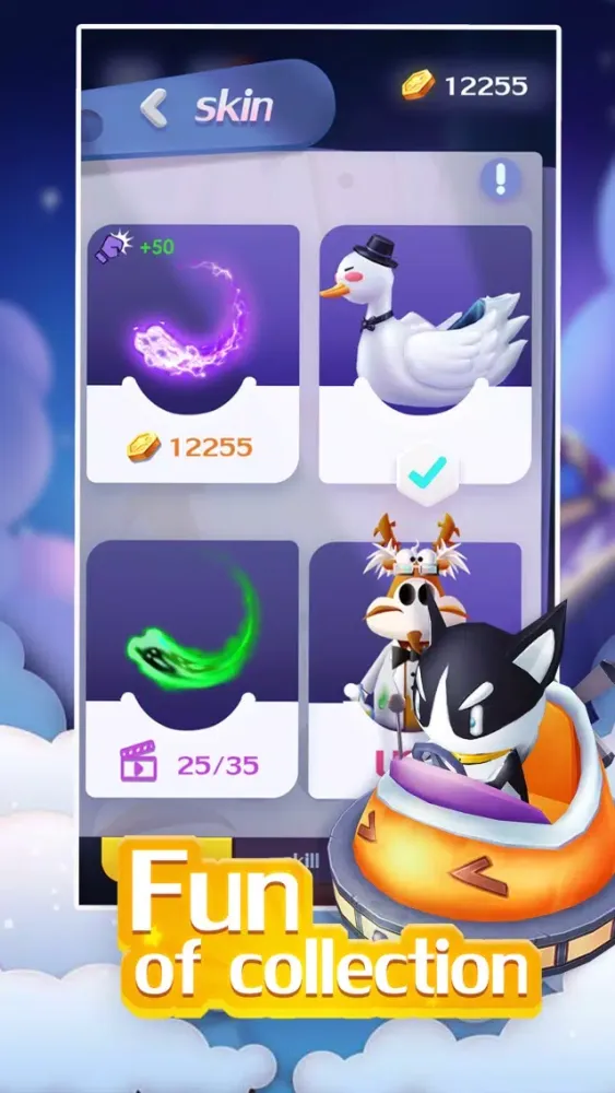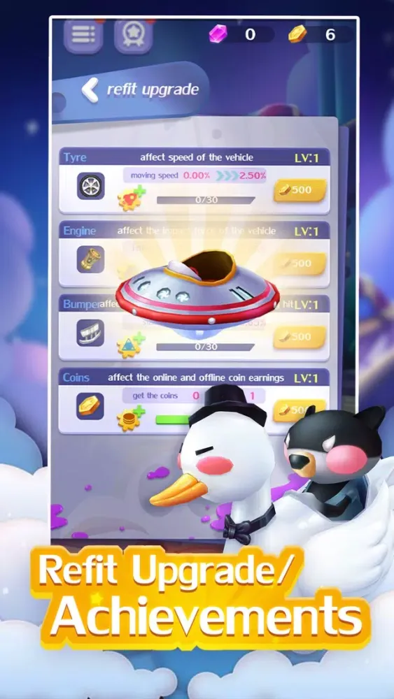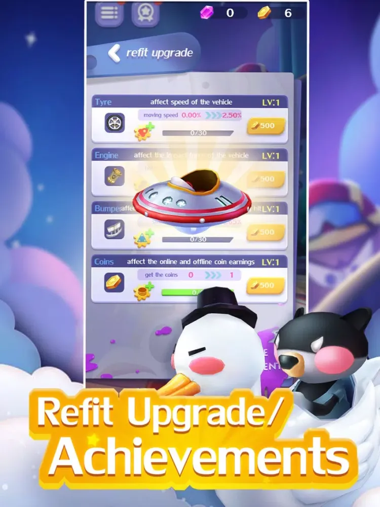 Improve the tyre, engine and bumper of your vehicle to make you move faster, stronger and more stable.