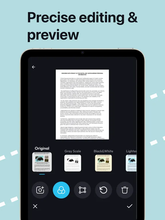 You can store your scans as multi-page files, allowing for later export in PDF or JPEG formats, depending on your needs. Whether choosing existing images from your Camera Roll or creating new scans with the app's built-in mobile document scanner, FaxScan facilitates document creation in a snap. Our sophisticated scanning algorithms enhance image quality and enable a wide range of document types to be scanned with the highest fidelity, ensuring your documents always look professional.