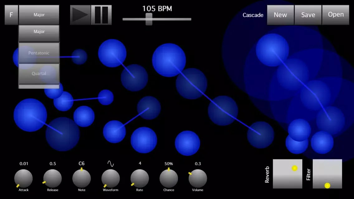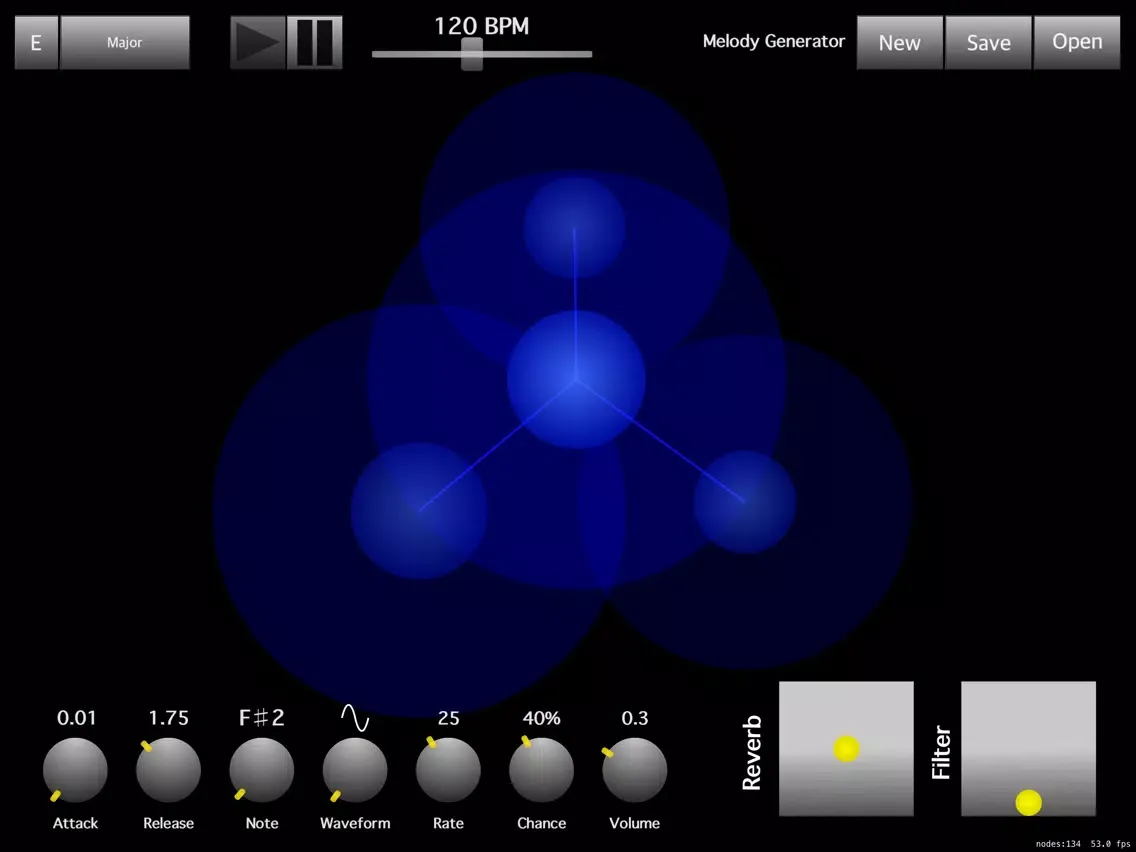 Using a straightforward interface, Melody Live allows you to quickly create and visualise your compositions, using up to 80 different nodes of sound.