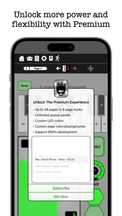 MIDI Designer Pro X (MDPx) is the culmination of over a decade of continuous improvements. In 2012, we launched MIDI Designer Pro, which we relaunched in 2016 as MIDI Designer Pro 2. MDP2 was the first and only professional-grade MIDI controller built natively for iOS, earning widespread critical acclaim. Since launch, we have released over 80 updates, greatly expanding features and functionality. Our library of user-created content now covers over 300 MIDI targets covering a vast array of music-making gear and software. In 2024, we take a significant leap forward with MDPx. This release elevates the user experience to new heights on iPad and Mac -- including a new, expressive theme called "Spaceship" -- while advancing usability massively for iPhone users. A new subscription model — Premium — allows even more users to use the App in their music-making and discover the App Store's best MIDI controller for themselves.