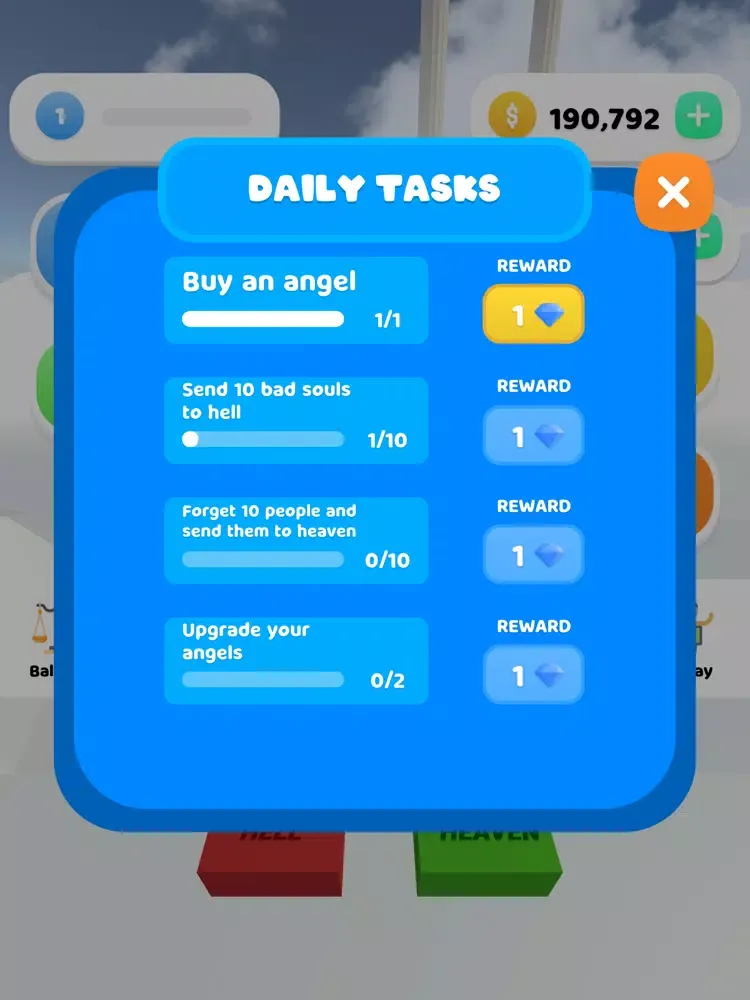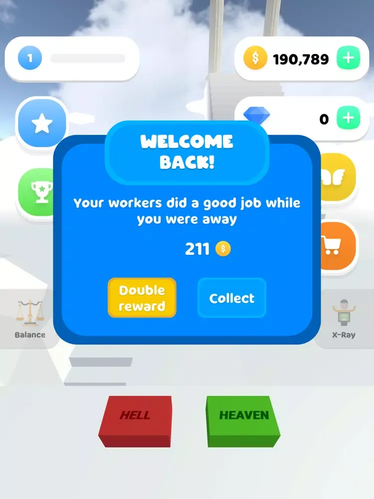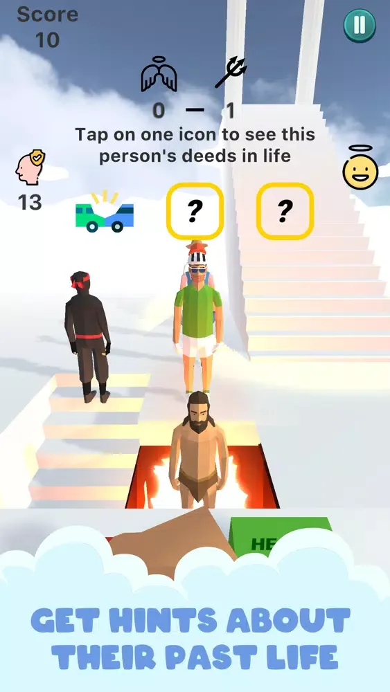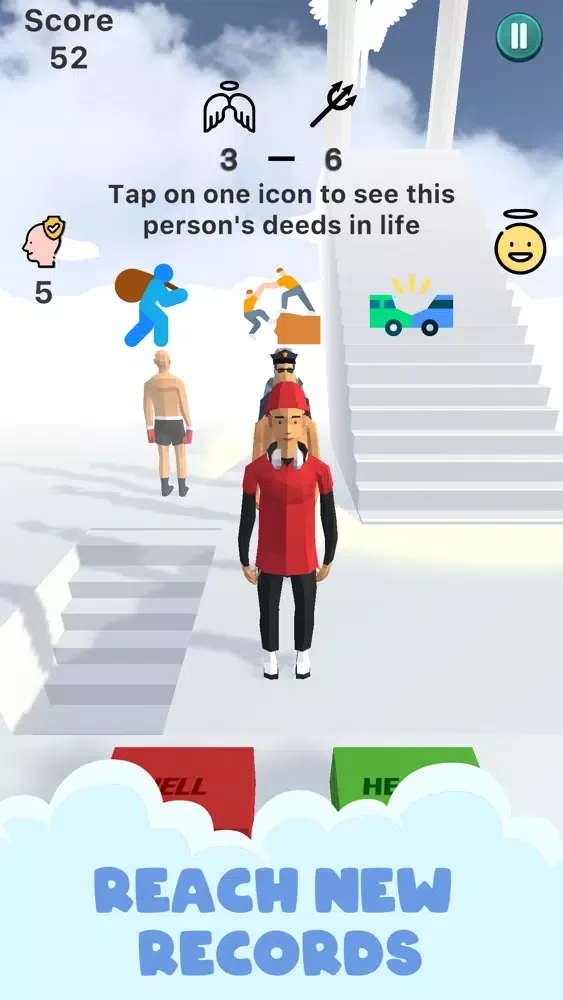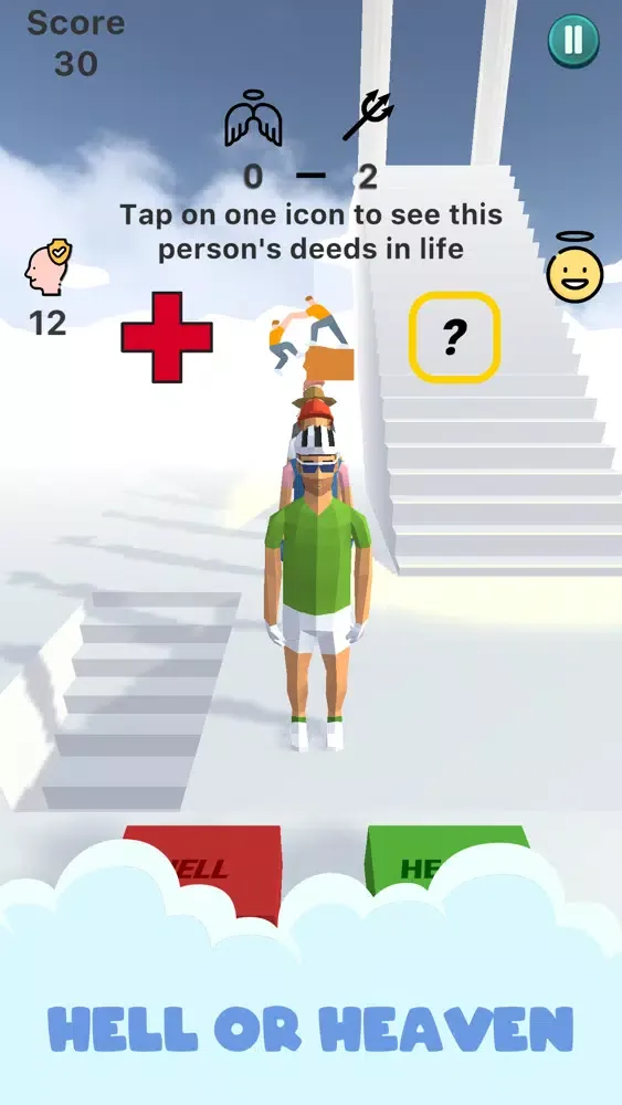 What is the game about? Well then, it's something really unusual and unreal. The game itself takes place somewhere between hell and heaven, where through the “Stairs to Heaven” you will be receiving people who you will have to judge according to their lived life and decide where they deserve to be. You will get hints about their past life by pressing on the question marks above their heads. It's all up to you :)