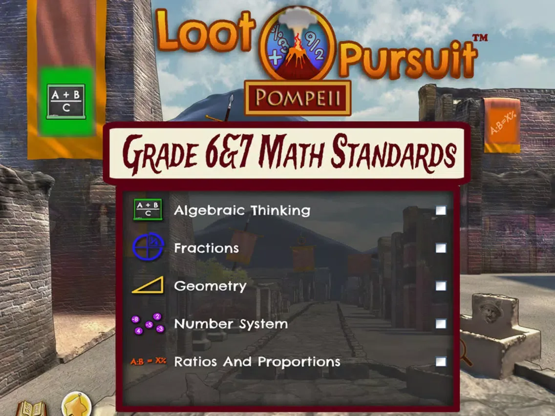 Loot Pursuit: Pompeii builds math skills for 6th and 7th graders in a fun, approachable way. The intuitive interface makes it easy for students to practice algebraic thinking, geometry, fractions, number system, and ratios with options for differentiation of skills.