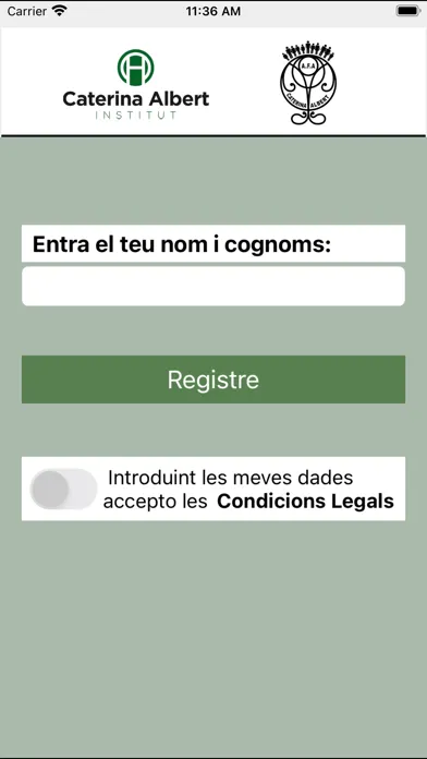 APP de l'Institut Caterina Albert. L'aplicació permet una comunicació directa entre el centre i els pares dels alumnes. Consta d'una primera pantalla de registre on s'identifica l'usuari. A continuació apareix un menú amb diverses opcions: secció de notificacions enviades per l'Institut -ja siguin generals o personalitzades-, informació sobre l'Institut, agenda d'esdeveniments, documents, secció pagaments, contacta, AFA i informació sobre el menjador.