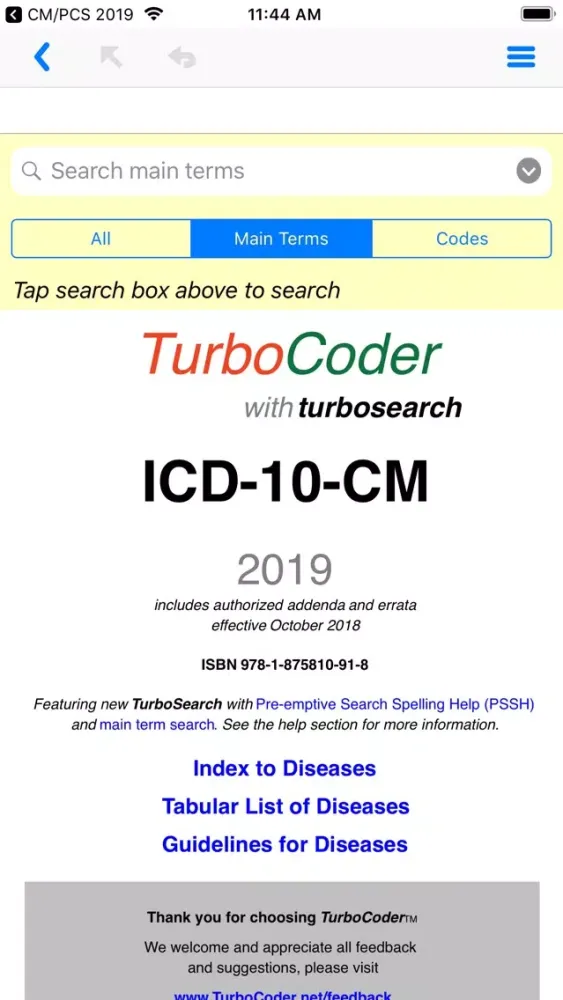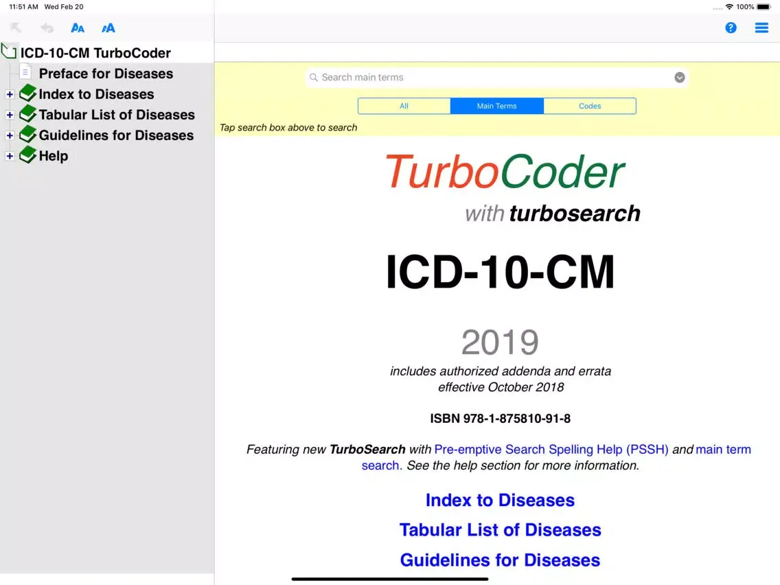 ICD-10-CM TurboCoder packages the complete 2019 International Statistical Classification of Diseases and Related Health Problems, 10th Revision, Clinical Modification (ICD-10-CM) along with the Guidelines for Diseases into one easy to use mobile application where every word, number and phrase is searchable.