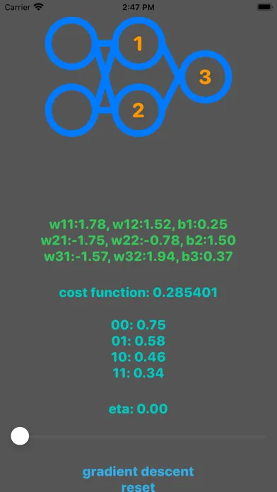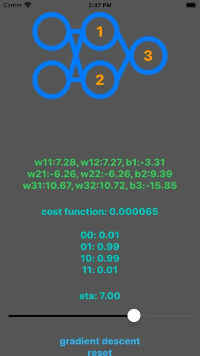 This app shows how neural networks determine parameters for XOR gate. If you click "gradient descent", 10000 iterations will occur on the app in order to determine 9 parameters.