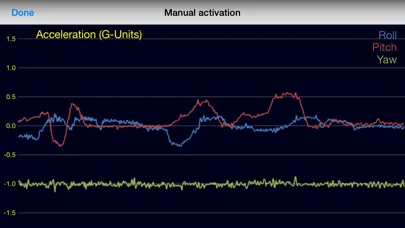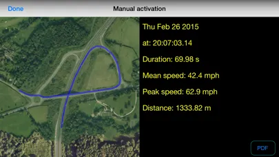 When triggered the app records the previous 60 seconds and following 10 seconds of GPS, accelerometer and gyro data at about 50 Hz. It also records up to the last 30 minutes of GPS position data. The data is stored in two CSV files which can be downloaded or forwarded to an email address of your choice. There is also the option to display the results within the app itself and you can create a PDF file of the results. When viewing the result graphs, swipe right to expand the view and swipe left to contract it again. Tapping on each of the graphs displays the next graph in turn. For full and detailed analysis of the incident however you will need to download the CSV files.
