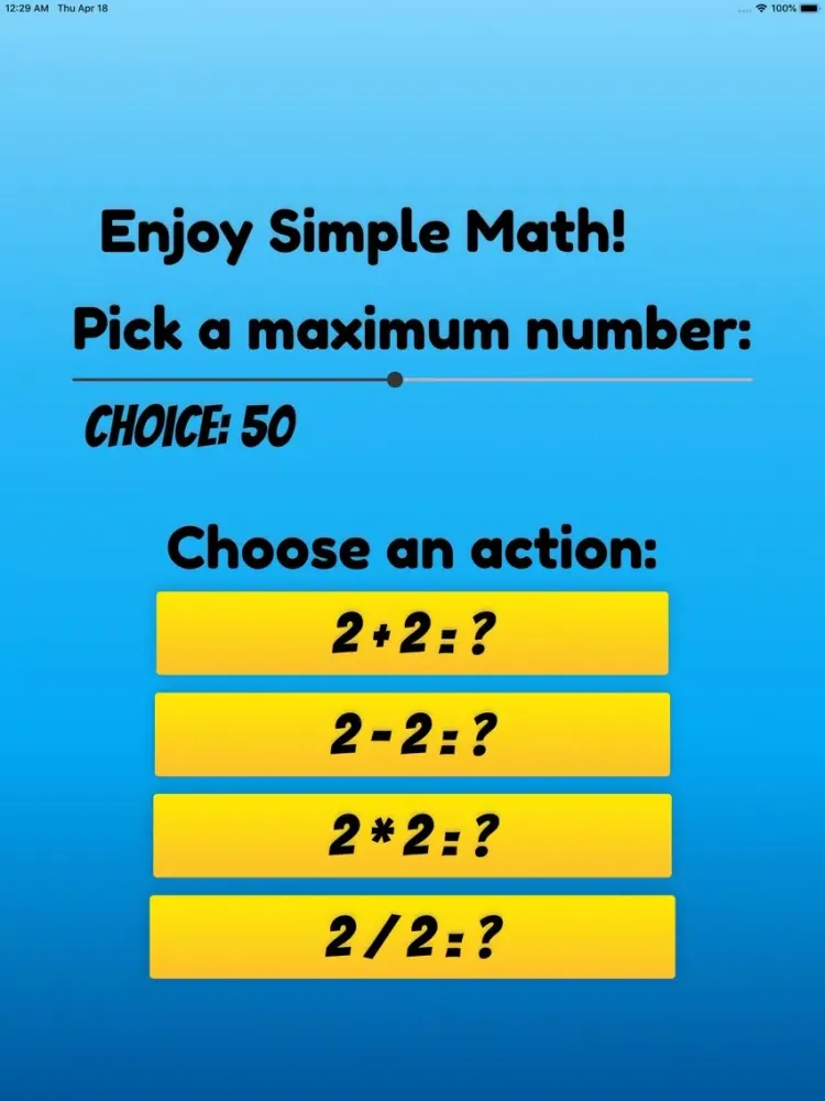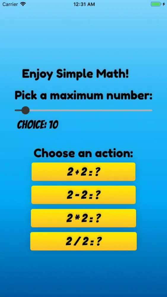 Basic mathematical operations as addition, subtraction, multiplication, division. With random numbers in your range and no time limit!