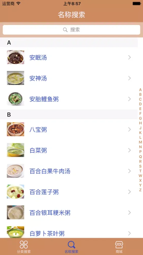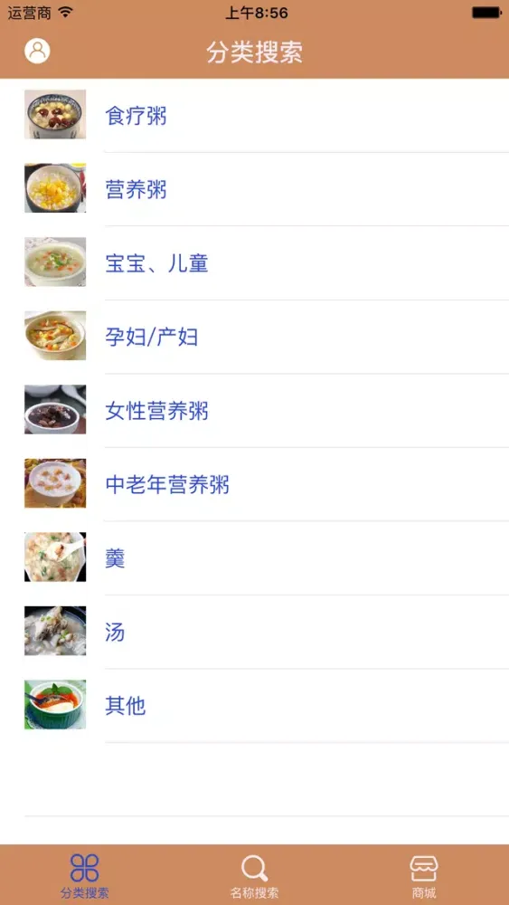 A. 分类搜索: 包括了食疗粥、营养粥、羹、汤等五大类;