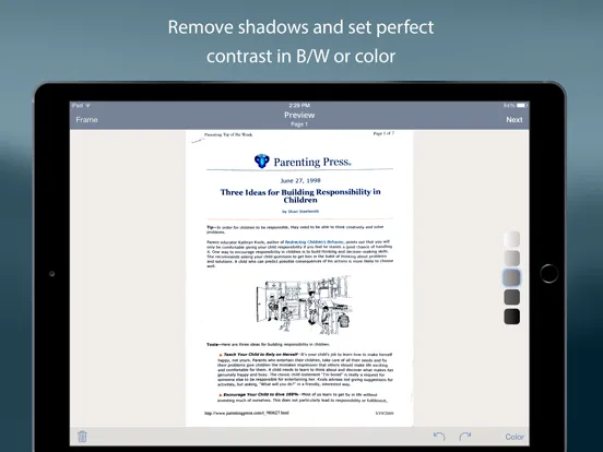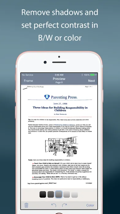 TurboScan uses advanced and fast algorithms to accurately detect document edges, straighten them (correct perspective), eliminate shadows and set a perfect contrast for black on white text. Color and photo modes are also available.
