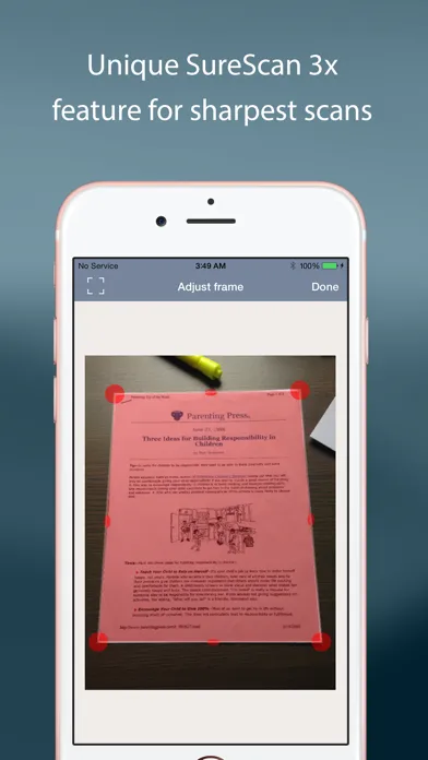 TurboScan also offers SureScan, our proprietary scanning mode for sharper scans (especially useful in low-light conditions.) SureScan automatically takes three pictures of the same document, giving you a guaranteed perfect result every time.