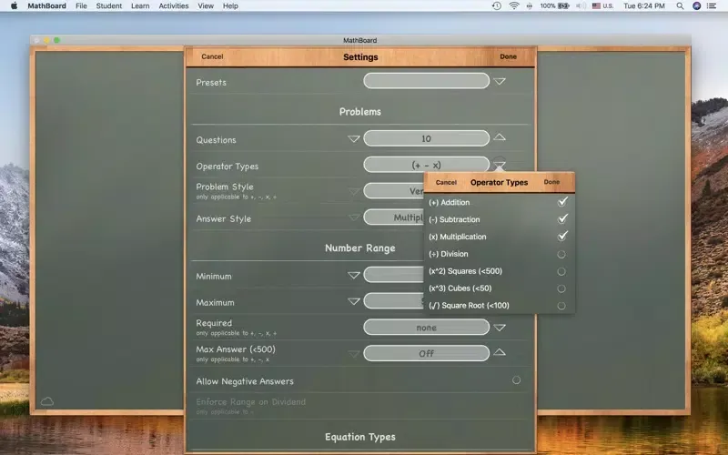 - Random equation generation for Addition, Subtraction, Multiplication, Division, Squares, Cubes, and Square Root problems.