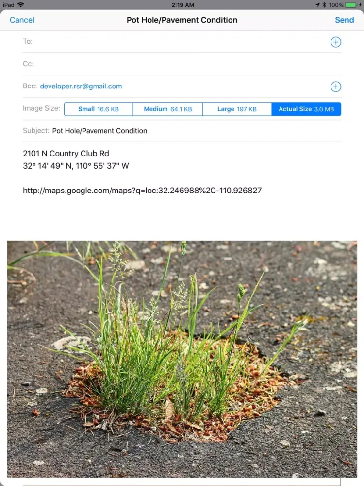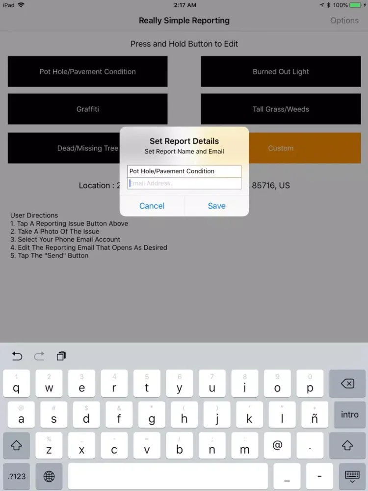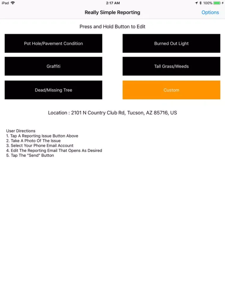 Free one tap city reporting of graffiti, pot holes, burned out street lights and more. Simply open the app and press one button. The app automatically (1) takes a photo, (2) pulls your GPS location, (3) pre-fills the request, and (4) emails all the information to your city mayor.