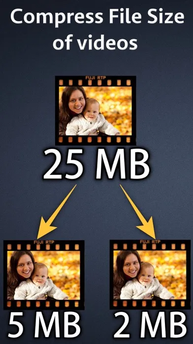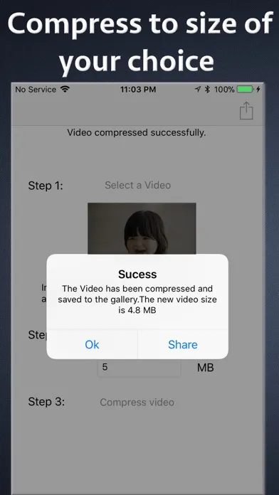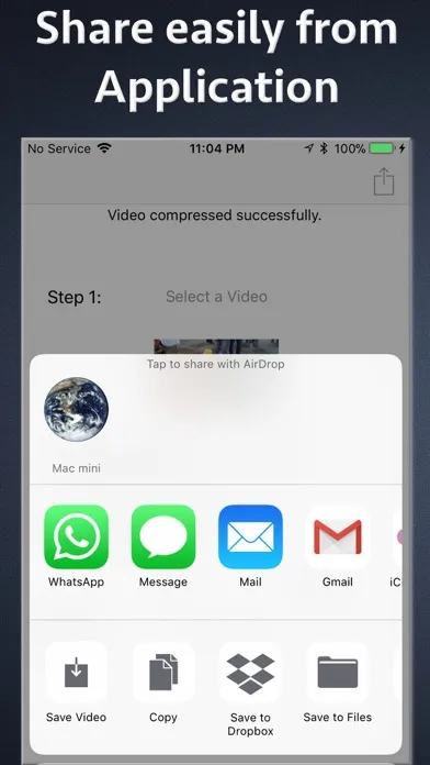 In order to compress the video, just select it from gallery ,specify the required size and click on "Compress Video" button.The application will reduce the video size and it will save it to gallery.It will also display a share page using which you will be able to share the video directly with various other applications and services like WhatsApp, iCloud, Mail, AirDrop,Save to Files,Cloud services and many more.