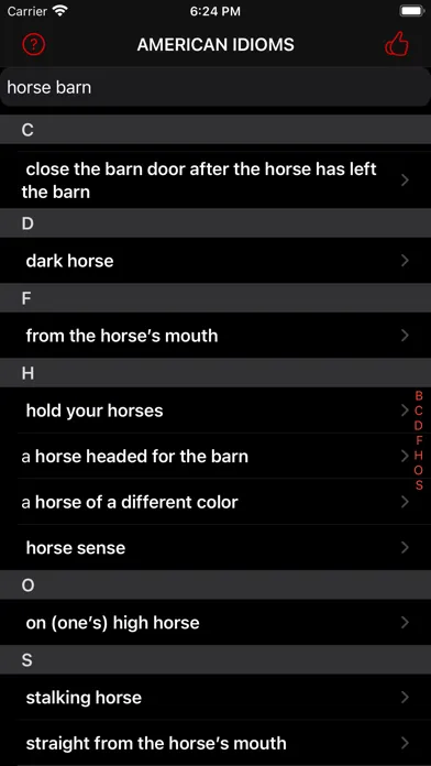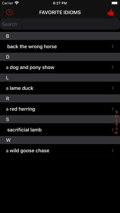 In American Idioms, you can easily search for idioms using keywords in a flexible format, like "duck," "lame," "lame duck," "duck lame", or even partial words like “lam duc". You can add personal notes to any idiom and mark your favorite idioms for inclusion in a separate list.
