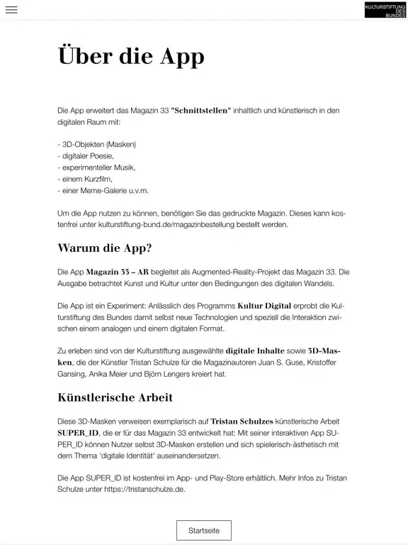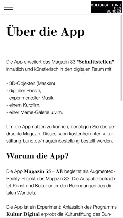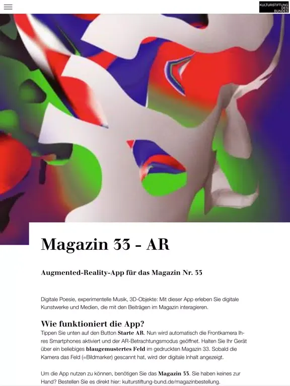 Diese AR-App erweitert das Magazin 33 „Schnittstellen“ der Kulturstiftung des Bundes inhaltlich und künstlerisch in den digitalen Raum: Erleben Sie digitale Poesie, experimentelle Musik, 3D-Objekte, eine Meme-Galerie u.v.m. Für die Nutzung der App benötigen Sie das Magazin 33. Dieses kann kostenfrei unter kulturstiftung-des-bundes.de/magazin bestellt oder online gelesen werden.